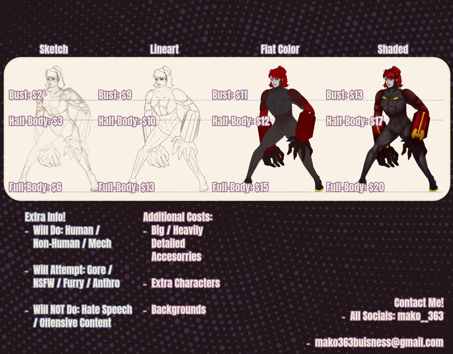 - If you are interested in contacting me, all my socials are @mako__363- I use cashapp and venmo for payment, if that doesn't work I'm open to discussing things!- Prices may vary depending on style and detail.